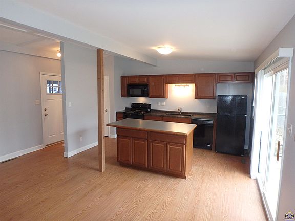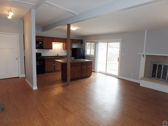 Open floor plan 3 bed 1 bath ranch home on large corner lot. Down to studs remodel in 2014 has been refreshed with new interior/exterior paint and new carpet. Vaulted ceilings throughout and lots of light through the large windows make for an open feel. Kitchen includes all appliances and large center island for food prep or dining. All bedrooms have large closets with organizers. Updated double pane windows and rolling shutters on bedroom windows are great for privacy energy efficiency and security. Outside you have a large corner lot with fenced back yard and patio. Covered parking with covered entry/patio area. Small built-in storage shed. Hi Efficiency furnace. Seller is a licensed agent in the state of Kansas.
