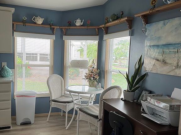 Beautiful home for sale.  Exterior completed resided.  All new double pane windows.  New flooring.  Both bathrooms newly remodeled with walk-in showers.  Kitchen remodeled and new appliances.  Close to both pools and club house.  Beautiful view of the lake from the newly remodeled sunroom.  Large living room, kitchen and bedrooms.  In house Laundry room exits to large golf cart garage with work bench.
