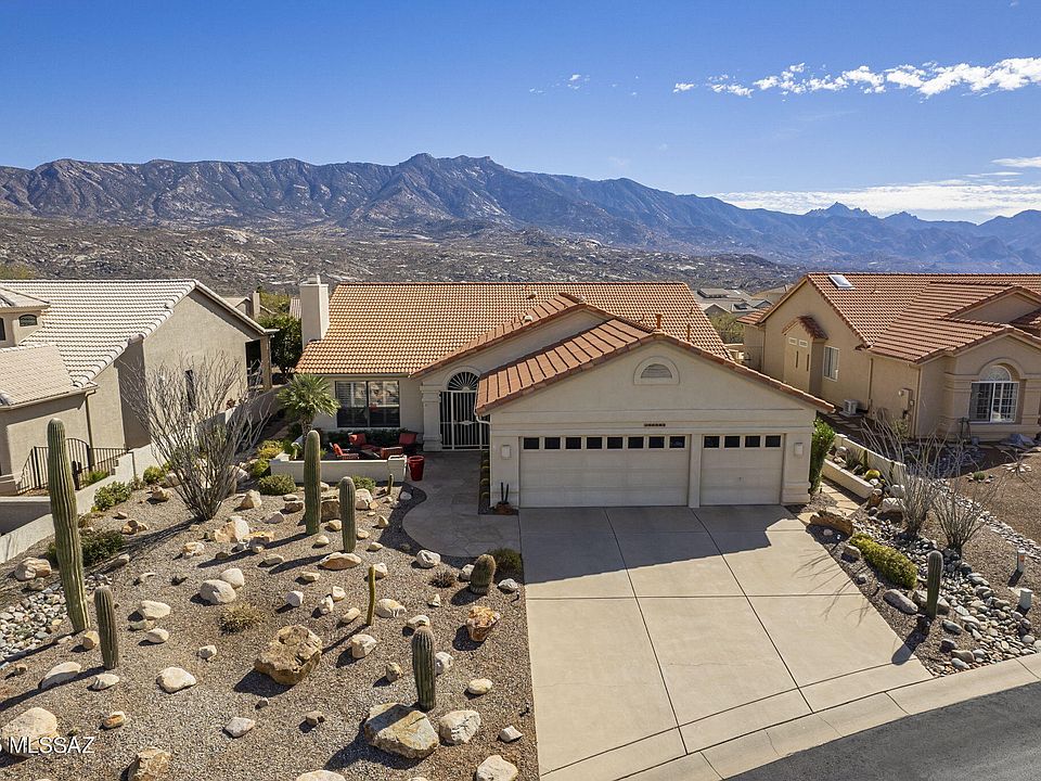Unparalleled, Panoramic Mountain Views from this Stunning, Impressively Updated 1 Story Galleria Model sited on one of the Highest View lots in SaddleBrooke! Welcoming flagstone courtyard leads to double entry front door. Kitchen boasts contrasting granite counters, elec induction cooktop, SS apps, large walk-in pantry, staggered height cabs, large island w/storage. Numerous addl features include granite topped wet bar, large master suite w/bay windows, his & hers closets, impressive bath w/new cabs/counters & generous sized walk-in shower. Fully extended flagstone patio w/elec shades, gas beehive FP w/bench, mature SW landscaping & forever views! Large laundry w/GE front loaders on pedestals. Full 3 car garage. 2 new HVAC units installed in Fall 2024!