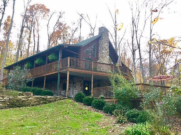 You will love this Hocking Hills log home on a private wooded five acre parcel. The sweeping paved driveway leads to the well designed perennial landscape surrounding this 3BR/3BA home that features ample room for indoor and outdoor enjoyment. Essentially there are three suites, one each level. The kitchen is open to the great room with a natural stone highlighting the wbfp and custom windows to frame the views. A family room on the lower level that was completely finished in 2010 to include a hearth for additional wood stove. The LL is a walkout to the covered and open deck. All appliances, washer and dryer are included. The detached 26'x24' 2+ car log garage has work space and storage space + an attached carport. Easy access to Wayne National & Hocking Hills destinations.