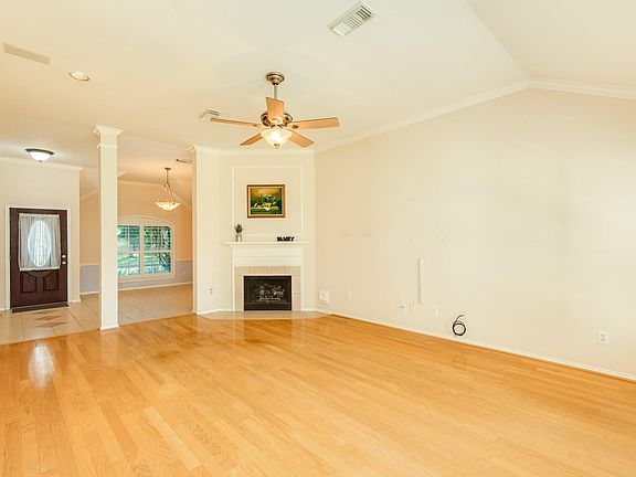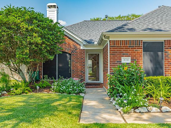 Welcome to this beautifully maintained single-story brick front home offering timeless curb appeal and mature landscaping on a quiet, tree-lined street. Step inside to a bright and open floor plan featuring a spacious family room with vaulted ceilings, wood-look floors, and a cozy fireplace. The formal dining room is perfect for entertaining, while the kitchen boasts white cabinetry, stainless appliances, solid-surface counters, and a breakfast area filled with natural light. The private primary suite includes a wall of windows with plantation shutters, vaulted ceiling, walk-in closet, dual vanities, soaking tub, and separate shower. Secondary bedrooms offer wood-look flooring and versatility for guests or a home office. Enjoy outdoor living in the fully fenced backyard with patio, mature trees, and plenty of space for gardening or play. Additional highlights include a utility room with washer/dryer, two-car garage, and convenient location near shopping, dining, and major highways.