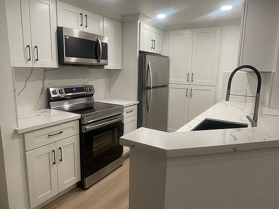 Freshly painted, remodeled kitchen, and new floors. Vaulted ceilings and recessed lighting throughout. Nice size rooms, master suite with private bathroom and large closets. Community pool and hot tub. One car garage plus an assigned parking spot and plenty of visitor parking. Rent includes water and garbage.