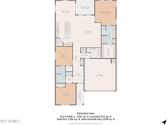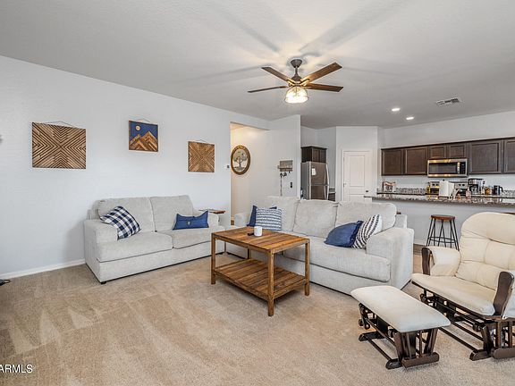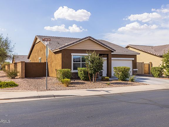 Welcome to this charming home on a huge 7,227 sqft premium lot in the desirable Sorrento Community! This well-thought-out floor floorplan features 3 bedrooms, 2 bathrooms, 2 car garage, and an open great room layout. The kitchen is beautiful with dark cabinets with crown molding, granite countertops, recessed canned lighting, a kitchen island with breakfast bar, walk-in pantry, and stainless-steel appliances. The primary suite is spacious with an ensuite bathroom featuring a vanity desk and a walk-in closet! This home is spotless and move-in ready! Bedrooms 2 and 3 share a jack-and-jill bathroom and finished with a neutral paint color. The backyard features a covered patio and lush grass on an oversized lot! Do not miss this opportunity to view this gorgeous home! Sorrento is a serene community in Maricopa, close to restaurants, shopping, entertainment, golf courses, and much more!