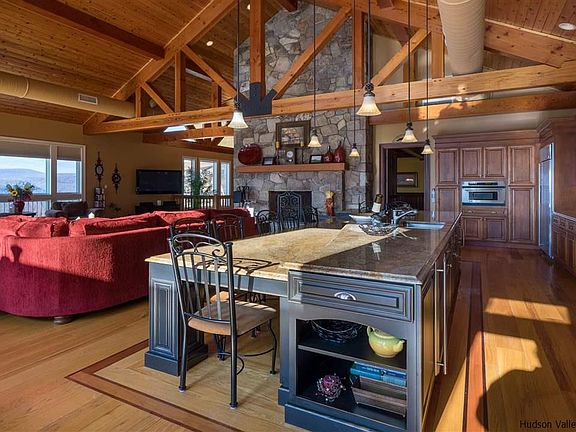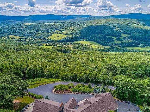 High up in the mountains with absolutely beautiful panoramic views of the Catskill Mountains and beyond sits this Grand Estate surrounded by 114 Acres of nature's beauty. A true show-piece and the perfect spot to entertain and escape from it all, built and custom designed with no expense sparred. Incredibly inviting great room with stone fireplace sets the stage for an awe-inspiring atmosphere, including in this area are the kitchen, dining, and living room complete with vaulted ceilings of timber frames and floor to ceiling windows to take in the views that surround you. With the gourmet kitchen offering custom Cherry cabinets and granite island with seating for up to 10 people it's a real Chef's dream with all the high-end appliances you could want. If you're looking for space a little more cozy, step into the parlor complete with pool & poker table and wet bar with its very own fireplace offering a real sophisticated feeling with rosewood floors and cherry pillars along with French doors leading out onto a patio. Down the opposite wing of the house you can find relaxing and spacious bedroom suites offering you the quiet and peacefulness you would expect in the Catskills. Double master suites boast large jacuzzi tubs and private access to balcony so you can step outside and really take in the breathtaking views. Or perhaps outdoor space and nature is what you are after, the land offers you endless activities all year round, from hiking and 4-wheel on your very own trails to spacious patios perfect for outdoor gatherings.