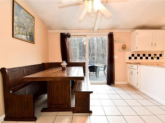 Presenting a large 4-5 bed, 2 bath split-level home centered on two acres of private, wooded land. The spacious and versatile floorplan features cathedral ceilings in the main living area, a stone fireplace with a new wood stove insert in the living room, a formal dining room, and a full bath on each floor. Sliding glass doors lead from the dining area out to a deck and patio surrounding the heated, inground saltwater pool ~ a private backyard oasis perfect for outdoor entertaining! Upstairs, you'll find three additional bedrooms including the primary bedroom with its own pergola covered deck. Additional highlights include an integral two-car garage, a young roof, and a house generator. A few cosmetic touches will make it your own!
