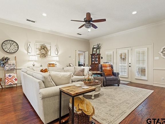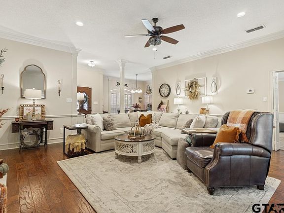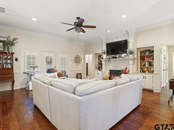 Wood-burning fireplaceJust under an acreWood and tile flooringCovered patioCorner lotCrown moldingCircle drive
