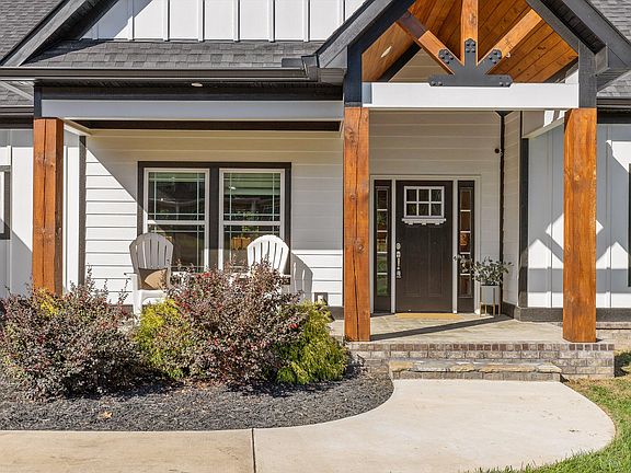 Quality craftsmanship and thoughtful design come together in this beautiful Chickamauga home. Step through the two-toned Craftsman-style front door into a spacious living area featuring a natural stone fireplace with a rough-cut timber mantel and shiplap accents extending to the vaulted ceiling.