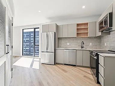 Move right into this spectacular new construction apartment offering modern design and high end amenities! The residence features a sleek, contemporary kitchen with muted grey cabinetry, stainless steel appliances, a stylish tile backsplash, and built-in open shelving for a chic look. Enjoy bright, spacious rooms with oversized windows that flood the space with natural light and offer expansive city views. The unit boasts beautiful light wood style flooring throughout and a modern bathroom with a glass enclosed, tiled shower and a designer vanity. Plus, enjoy exclusive building amenities including a state of the art fitness center with Pelotons and a stylish residents' lounge. Don't miss this opportunity for luxury living in a prime location!