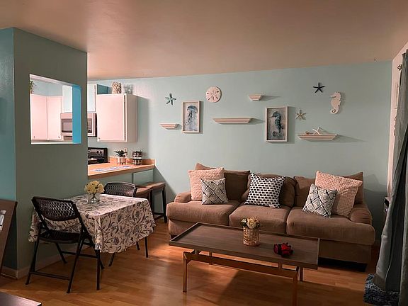 Welcome to this beautifully decorated 2-bedroom, 1-bathroom condo featuring a vibrant beach-inspired design and modern conveniences. The open-concept living room is filled with natural light, accented by custom ocean-themed murals and decor. A spacious sectional makes it the perfect spot to relax or entertain.