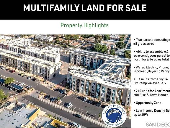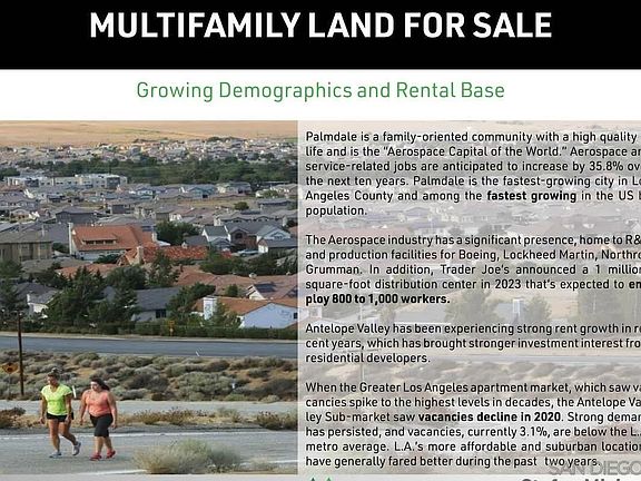 Prime Investment Opportunity in Palmdale, a thriving aerospace hub with a severe housing shortage and robust economic growth. No new apartment developments in over 30 years have created an extreme supply/demand imbalance, perfect for residential development. Key Highlights: High-Demand Market: Home to 20,000+ well-paid aerospace professionals from Northrop Grumman, Lockheed Martin, Boeing, General Atomics, and NASA at USAF Plant 42. Major Economic Drivers: Recent long-term defense contracts, including 80 Billion for B-21 bomber jets, Skunk Works AI and robotics programs, and Supersonic X-Plane development. Job Growth: Immediate technical and assembly jobs, with 2,500+ new positions driving 6,000+ support jobs in the local economy. Regional Commitment: Lockheed Martins new 208,000 SF advanced manufacturing facility (2022) underscores long-term investment in Palmdale. Capitalize on this rare opportunity to develop in a high-growth, underserved market with strong economic fundamentals. Perfect for residential or mixed-use projects.