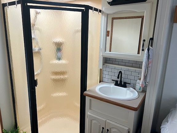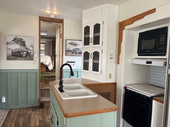 Step into cozy comfort with this beautifully decorated one-bedroom, one-bath 5th wheel home, perfectly situated on a lovely lot with plenty of storage inside and out. Hidden storage, including a small lockbox, adds to the convenience and practicality of this home. With a spacious living area, plenty of cabinet space, and tasteful furnishings, this home is designed for comfort and style.Recent upgrades include a brand-new air conditioner, new laminate flooring, new carpet, new plumbing, a new toilet, and a new TV, offering you modern amenities with a touch of charm. The home backs up to a common area, providing extra privacy and a serene setting.Located in a vibrant 55+ amenity-filled community, you'll have access to a wide range of activities and conveniences. Enjoy the heated pool, shuffleboard courts, horseshoes, and a nature walk with picnic tables and seating that leads to an island on the pond-perfect for enjoying your morning coffee or afternoon drinks. The outdoor kitchen and regular community events will ensure you always have something fun to do.This home is truly a must-see to appreciate all it has to offer. Don't miss out-schedule your tour today!
