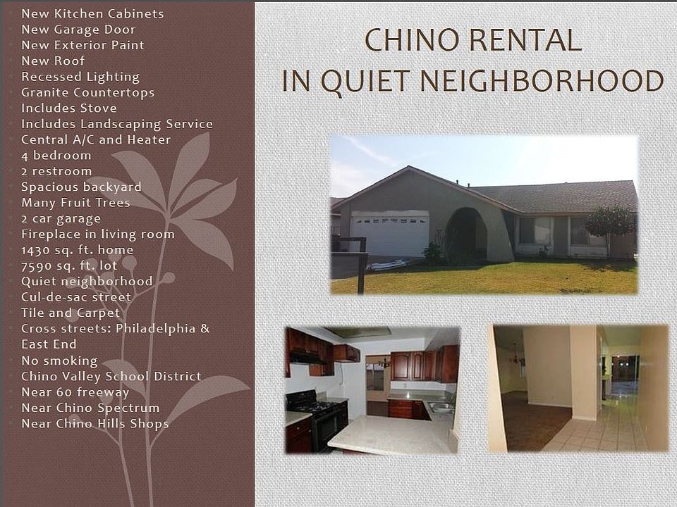 New Kitchen Cabinets New Granite Countertops New Garage Door New Exterior Paint Stove Included Recessed Lighting Landscaping Included Central A/C and Heat 4 bedroom 2 restroom Spacious backyard Many Fruit Trees 2 car garage Fireplace in living room 7,590 sq ft lot Quiet neighborhood Cul-de-sac street Tile and Carpet Schools for this address: Newman Elementary, Ramona Jr High & Don Antonio High School Chino Valley School District Near 60 freeway Near Chino Spectrum Near Chino Hills Shops Available for move now Cross streets: Philadelphia and East End Rent Amount $1,900 Deposit: $1,900 (depends on credit can be paid in 2 months great credit can lower deposit) Rent includes landscaping Outdoor pets are okay No smoking inside house No eviction history Single family home For rent by owner, no scams or middlemen. Se habla espanol text or call Alex 323 781 eight one eight eight Must pick up application in person , located in Ontario. Call to obtain address Min. 1 year lease Credit check required Please be prepared to provide: Completed application 2 months paystubs 2 months bank statements 2 years W2s $30 for credit application
