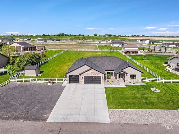 Enjoy peaceful country living just minutes from Twin Falls and Filer in this beautifully designed single-level home. The open, airy split floor plan features durable LVP flooring, abundant natural light, surround sound in the living area and a cozy propane fireplace. A chef’s kitchen shines with a 5-burner gas range, double wall convection oven, ample prep space, and stylish finishes. The spacious primary suite is a true retreat, offering a walk-in tile shower, large soaker tub, and direct access to the massive covered back patio with extended patio areas on each side. The back patio holds a hot tub hook up, surround sound & is wired for a TV. The property allows space for RV parking, a future shop or barn, animals & garden space. Enjoy water at the back of the property, for your future garden or animals. Whether you're hosting gatherings, enjoying quiet evenings under the stars, or planning your next project, this home combines modern comfort with rural charm.