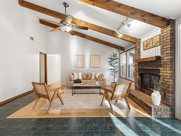 Side entry garageMetal roofCedar wood detailsNew exterior paintThermal efficient windowsBrick fireplaceMaple hardwood floors