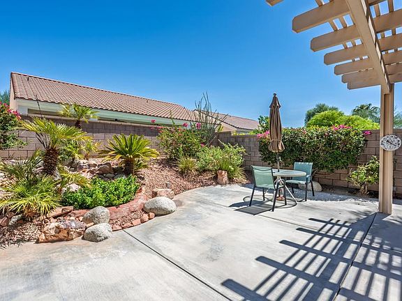 Sun City Palm Desert - St. Maarten. This sought-after St. Maarten greatroom floorplan offers 2 bedrooms, 2 bathrooms, plus a den. The spacious east-facing backyard features an extended patio with alumawood cover and lush desert landscaping for outdoor enjoyment. Updated exterior paint and vibrant flowering cacti enhance curb appeal. Inside, tile flooring extends throughout the main living areas, while the great room opens directly to the rear patio through sliding glass doors. The kitchen includes a chef's island with breakfast bar, Corian counters, a bright recipe window, and a pantry. Off the hallway, a generous den makes the perfect office or hobby space. The primary suite offers a bay window, large walk-in closet, and bathroom with sitting vanity and glass-enclosed shower. A guest bedroom with walk-in closet is adjacent to the full guest bath with tub/shower combo. Additional highlights include a laundry room with built-in storage, a 2-car garage with cabinetry, and a newer AC unit installed in 2019.