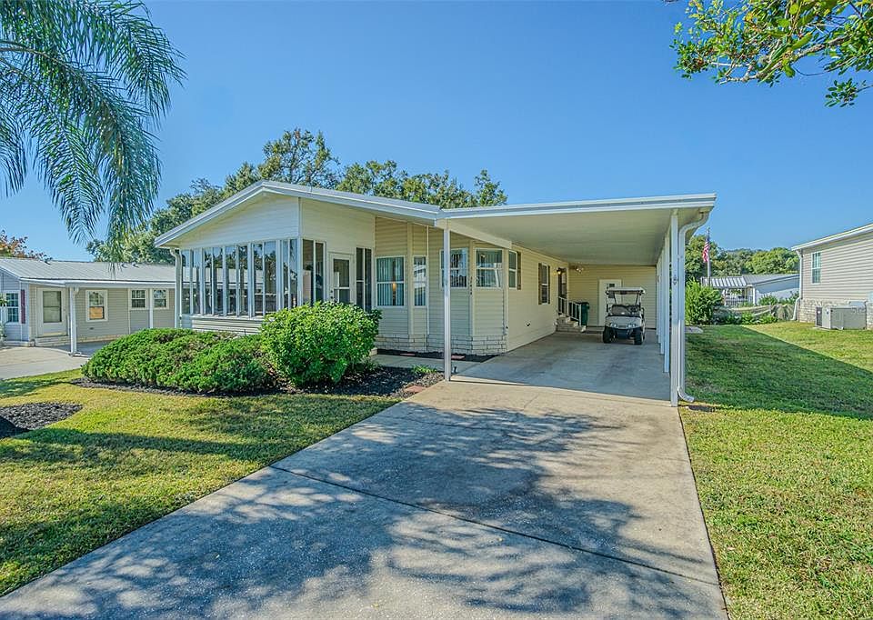 FURNISHED & Turn-key, GATED Grand Horizons home on exterior lot...barely used, meticulously maintained and ready for YOU! Enter from your covered carport into a Vaulted FLORIDA ROOM on the front of the home, with slider windows and tropical views! Sliding doors into the Spacious Living room provide a bright and airy feel! Kitchen is at the front of the home with bay kitchen dining nook, loads of cabinets, all appliances stay and vinyl look laminate flooring. Formal Dining Area for entertaining is off the kitchen, OPEN to living room. Guest Bedroom is spacious and can double as a den or craft /sewing room with bed and large closet, adjacent to guest bath! Owners suite is at the rear of the home with wall to wall mirrored closet and full bath ensuite with additional linen closet and large shower. Inside laundry room with broom closet and cabinets above washer/dryer for additional storage. Large utility shed attached to carport with workbench, tools and extra storage. Furnishings and GOLF CART Negotiable. OWN YOUR LAND in this 55+ community with resident owned clubhouse, heated pool/spa, shuffleboard, library, billiards, commercial kitchen, planned onsite activities and travel excursions! Located in Zephyrhills just north of Tampa in Sunny Florida. CALL TODAY to see why this IS the place to BE!