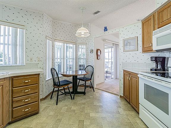 Tropical viewsGated grand horizons homeBright and airy feelBay kitchen dining nookVinyl look laminate flooringExterior lotSlider windows
