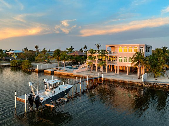Breathe in serenity during your escape to the ''The Castle'', a luxurious gated Gulf-front estate gracefully spanning 1.14 acres on Big Pine Key. This extraordinary retreat is a rare blend of architectural grandeur and coastal charm, thoughtfully designed for both relaxation and recreation. Boaters will delight in an unparalleled offering of 235 feet of dockage total: 140 feet of protected canal-front dockage featuring a 15,000 lb lift, cut-in slip, boat ramp, PLUS a 95-foot open water pier-style dock with additional 15,000 lb lift and cut-in slip - set against a 130-foot concrete seawall for secure, convenient access. Crafted in 2014 with solid poured concrete, impact-rated windows and doors, whole home generator and elevator, the home is built for enduring elegance. With over 4,600 square feet of refined interior space, this 3-bedroom, 3-bathroom estate is an architect's masterpiece with its stately presence, curved openings, and striking double staircase. Step inside to a breathtaking panorama of endless open Gulf waters and nightly sunset performances. The chef's kitchen is a dream for entertaining, featuring 10.5-foot island with seating for 8, dual sinks, refrigerators, and ovens, plus Jenn-Air 6-burner gas cooktop with pot filler, and rich wood cabinetry. Enjoy the grand family room with Gulf views, host movie nights in the private theater, or dine al-fresco under the stars. Nearby, find the full-size laundry room and storage. The top-floor primary suite is a sanctuary, offering sweeping water views, home office, private lounge with kitchenette, spa-like bath with clawfoot tub, tiled shower and generous walk-in closet with additional laundry. Outside, the resort-style pool beckons with a spa, water features, LED lighting, plus heater and chiller. Rooftop deck with 180-degree views, and unrivaled sunsets await. Offered fully furnished, including a 2023 Sea Cat, 14.5' skiff, and 2015 Chevrolet Silverado - this is ultimate Keys living without compromise!