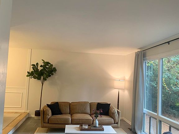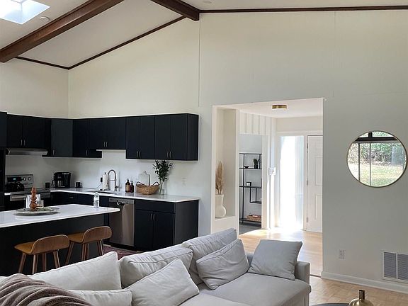 Tucked away among mature trees, this stunning three-bedroom, two-bath home perfectly blends contemporary style with timeless character. The light parquet floors, quartz countertops, and clean architectural lines create an airy, modern feel, while the thoughtful updates preserve the home’s original charm. The open-concept layout offers exceptional flow, ideal for both everyday living and entertaining. The beautifully designed kitchen features a bright eat-in area and opens seamlessly to the living space, surrounded by natural light and serene views. Every detail of this home feels intentional, comfortable, and effortlessly sophisticated.