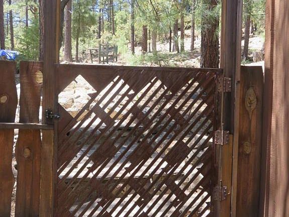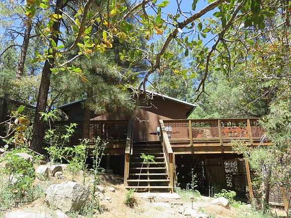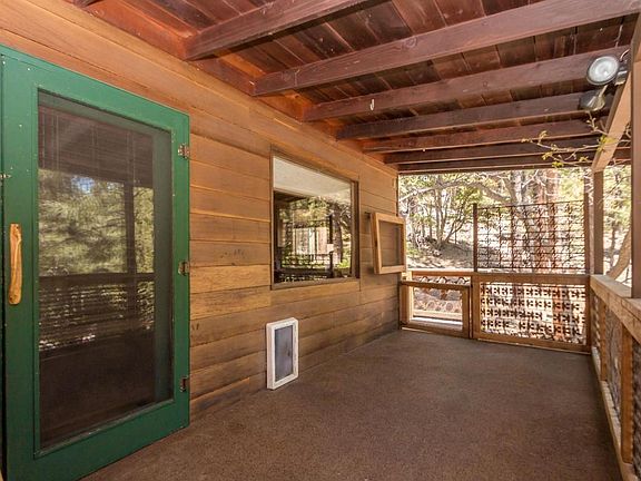Very private year 'round cabin, nestled in the tall ponderosa pines. Take a walk down the custom all stone walkway which leads to a fully enclosed courtyard area. Inside are vaulted ceilings with handcrafted trusses throughout the home with t&g ceilings. There are 2 bedrooms, one bedroom with its own private on-suite including closet, oversized vanity, separate tub and shower and private toilet area. Also a second bedroom with large walk-in closet and second full bath in main cabin. The open floor plan has a large great room area with beautiful wood burning stove. The open area flows right into the chef's kitchen with custom cabinets, oversized gas range, kitchen island, plus many more features. Separate dining room within the open floor plan. There is a detached 144 sf guest house complete with 1/2 bath and walk-in closet. Step outside onto the spacious covered & open deck areas with propane connection for grill/heater. Take a short walk down the hand laid rock pathway to the welcoming firepit area. The oversized garage is perfect for two automobiles plus has tons of storage in the vaulted ceiling. There are both a private well & hauled water w/2500 gal strg tank. Fenced deck & yard. Greywater system. Leased 500 gal propane tank. Lots of storage in unfinished basement. Large flat parking area. GREAT PLACE!