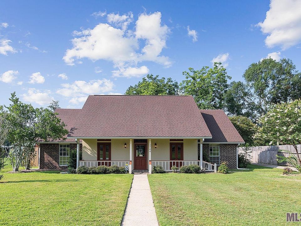This Acadian-Style, 3 bed, 2 bath home on a large lot in the heart of Zachary is move-in ready! The spacious home has plenty of room inside and out, to host those large Louisiana style get togethers! New carpet and wood laminate flooring was installed last week! The kitchen boasts granite counters, plenty of storage space with tons of cabinets, and stainless-steel appliances. The living room has a wood-burning fireplace with double doors on each side. The primary suite has a large en-suite bath that has 2 large walk-in closets, double vanities, and a soaking tub. The backyard is large and is fenced, with a gate on the side. The storage room opens from the carport and leads to double doors to load/unload your lawn equipment.