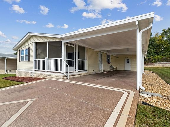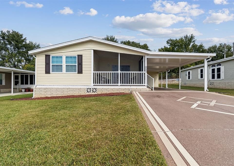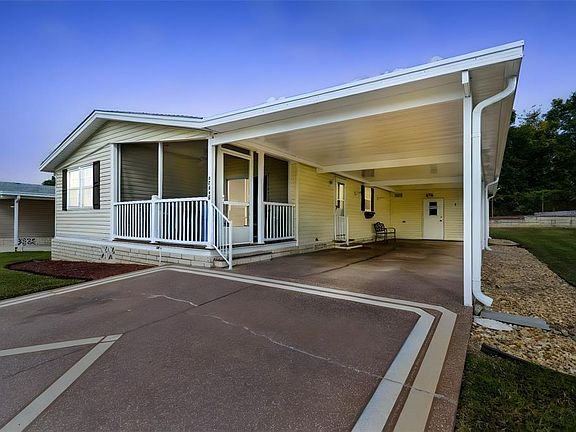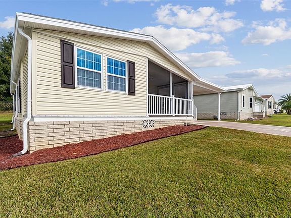 Beautiful Winter Retreat or Year-Round Home in Sunny Florida! Welcome to Grand Horizons, a gated 55+ community where you own your land! This beautifully maintained home sits on a quiet street with no rear neighbors and is move-in ready — just bring your suitcase! Assumable VA Mortgage available at an attractive 5.75% interest rate — a great opportunity for qualified buyers! Curb appeal stands out with lush landscaping, a widened driveway for side-by-side parking, and a covered carport. A screened front deck provides the perfect spot to relax and enjoy the Florida sunshine or entertain friends and neighbors. Step inside to a light and bright open floor plan, featuring a spacious kitchen and great room combination—ideal for gatherings. A bonus room just off the living area offers flexible space for a craft room, home office, den, or fitness area. The well-appointed kitchen boasts a convenient center island with breakfast bar, stainless steel appliances, and crisp white cabinetry. At the back of the home, you’ll find two generous bedrooms. The primary suite includes an extended closet, ensuite bath, and walk-in shower, while the second bedroom offers a large closet and easy access to the guest bath. Outside, there’s a spacious storage shed off the carport—perfect for tools, a workshop, or hobbies. Grand Horizons offers an active lifestyle with a resident-owned clubhouse featuring a commercial kitchen, billiards, craft room, and library. Residents enjoy regular community events such as potlucks, entertainment nights, golf cart parades, and planned excursions. The community features gated access from dusk to dawn and private streets perfect for golf cart cruising. Conveniently located just minutes from shopping, dining, medical facilities, bowling, movie theaters, the YMCA, and the Sarah Vande Berg Tennis Center, with easy access to Wesley Chapel, Tampa, Orlando, St. Pete, Lakeland, Ocala, airports, and Florida’s beautiful beaches.