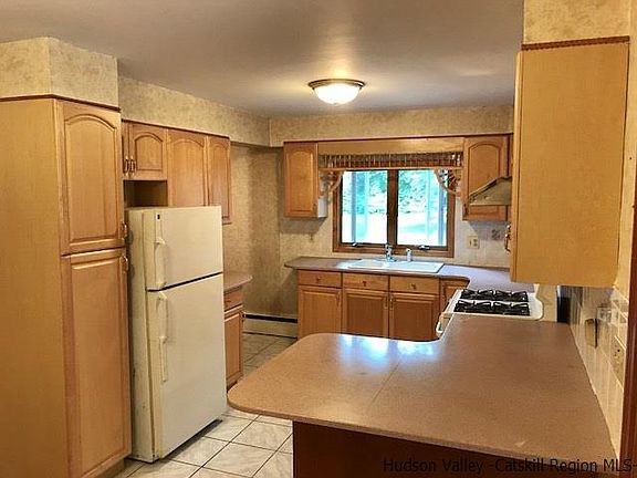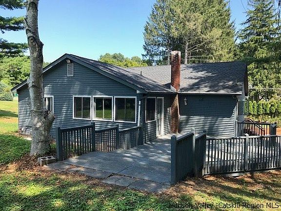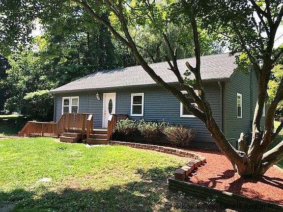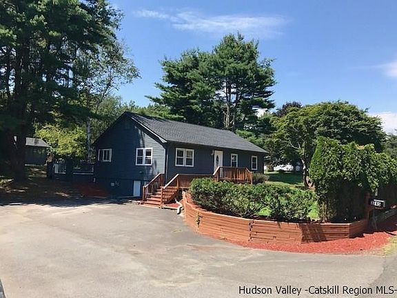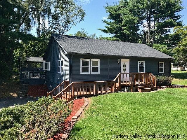 Beautiful little 3 bed ranch on landscaped parcel, perfect for family and entertaining. Located in the heart of Stone Ridge this home is close to the town center, and 20 min from Kingston and the bus to NYC. Just off the kitchen is a great 4 season room with vaulted, beamed ceiling, french doors and lots of windows. Then walk out the back to a large open deck, perfect for enjoyment and company. The backyard also has a separate 18x16 screened in cabana for additional 3 season dining or outdoor fun. The master bedroom has it's own master bath updated with stand up shower, jacuzzi tub and dual sinks. The main hall bathroom is dated and needs a remodel. Original hardwood floors throughout, the kitchen and full finished basement have ceramic tile. Washer and dryer convey, located in a large utility room in the basement. Exterior has new paint and roof in 2013. While the house and property have been well maintained, minor TLC is needed inside to make it your own i.e. some baseboard and outlet covers, a few fixtures, window treatments and some paint... appliances are not updated. Driveway off the road is shared with the neighbor, large paved parking area is not. Priced well at $189k this is a sweet little place and you cannot beat the location!