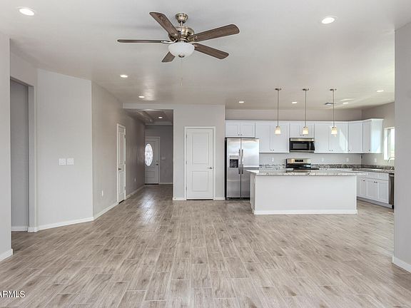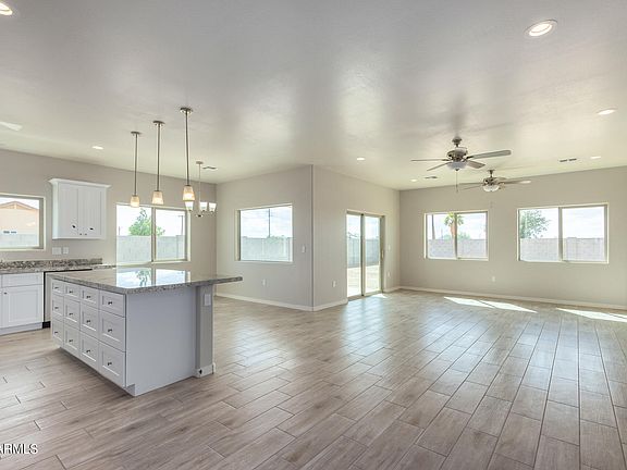 Stunning 3-Bedroom Home on a Spacious Non-HOA 15,000 sf lot. Be the first to own this beautiful brand new home! This thoughtfully designed 3-bedroom, 2-bath home features a desirable bright Great Room floorplan and a 2-car over-sized garage. The chef-inspired kitchen boasts a large island with pendant lighting, granite countertops, stainless steel appliances (range/oven, dishwasher, microwave), and two pantries for ample storage. The Primary Suite offers a tranquil retreat with a walk-in closet, double sink vanity, and a designer-tiled shower. Bedrooms 2 and 3 are strategically placed for optimal privacy with a nicely designed guest bathroom situated in between. Additional features include ceramic tile flooring throughout (with carpeted bedrooms), soaring 9 ft. ceilings, modern ceiling fans, upgraded light fixtures, recess lighting in LVR and kitchen, two-toned interior paint, block fencing, paved driveway, and drive-through RV gate. Don't miss the chance to own this must-see home! Home is now completed! (Pics are of a similar home, not exact color scheme).