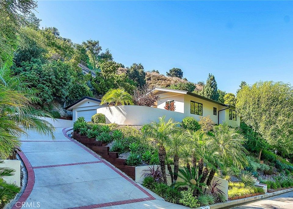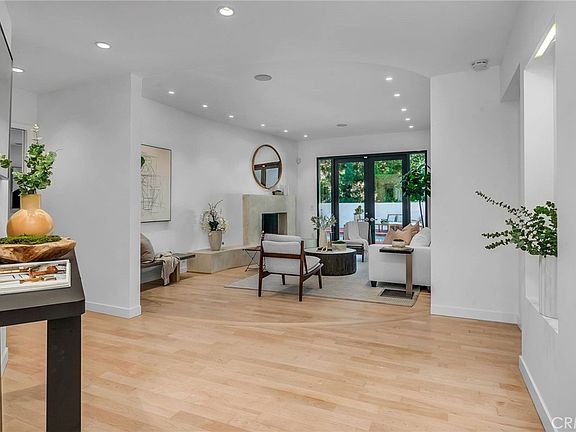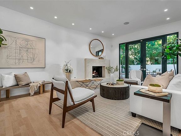 Perched high off the street, the entrance features a welcoming patio, stately water fountain, lush gardens & canyon views. Step inside to gorgeous refinished maple wood floors & LED recessed lighting leading to an alluring Living Room with fireplace & French doors opening out to the professionally landscaped drought-tolerant garden & sparkling pool.
