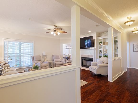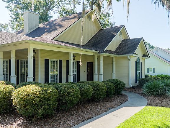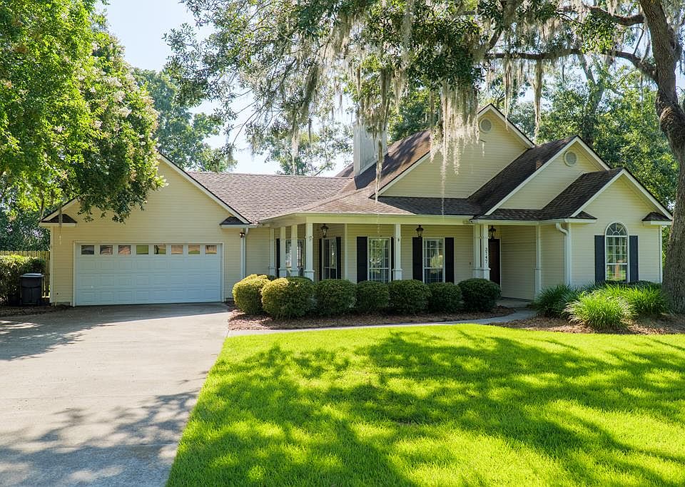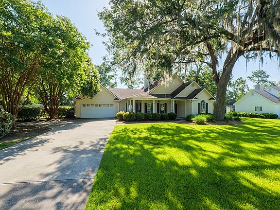 Loaded with Southern charm and style, this home is nestled on a lot with gorgeous Oak trees. The lovely front porch says welcome home. The interior finishes are exquisite. The family room has gorgeous wood floors, light colored walls and a fireplace. The family room has a large opening to the dining room and kitchen, ideal for those who like the semi-open Floorplan. Just off of the dining room is a small office, currently housing a treadmill. The kitchen is spacious, and has a great design for entertaining. The bar is perfect for guests or casual dining. The updated kitchen features white cabinets, modern pendant and coordinating breakfast room light fixtures as well as granite countertops. The primary bath and the guest bath have both been updated with new granite topped vanities. The primary bath also has an updated tile shower with a glass shower door. The primary bedroom and the guest suites are on the same side of the house but are not side by side. The two guests rooms are near the front of the home and share a hall bath. Just off of the kitchen is the covered out door living space that overlooks the pool(with a new liner just a few months old.) Additionally, there is a new water heater and a new HVAC unit. This gorgeous lot is also larger than most in the neighborhood.