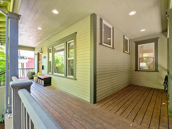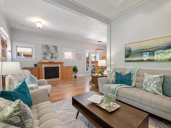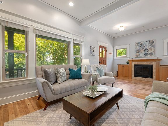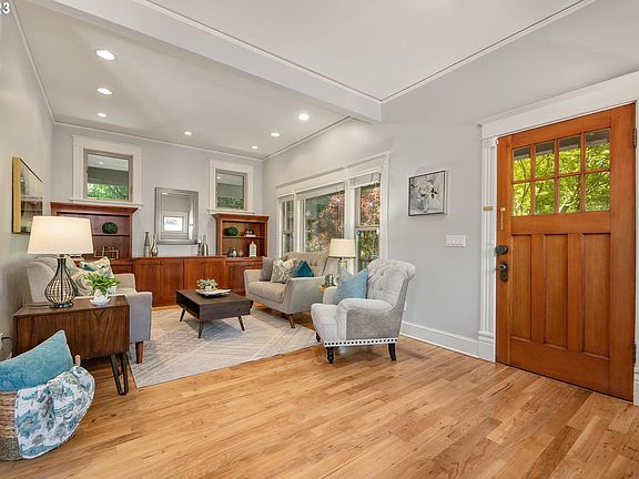 Sitting up off the street behind beautiful foliage, you'll find this gorgeous 1906 Craftsman. Remodeled from the studs out, it lives like a new house. The coveted open floor plan with lovely living room, dining room and kitchen tied together with refinished hardwood floors and huge windows create a light-filled main floor. Primary bedroom on the main floor (or choose from one of the bedrooms upstairs) with an incredible spa-like bathroom with beautiful slate tile, huge walk-in shower and the original clawfoot tub. The open kitchen is a dream... tons of workspaces, a pantry, and easy access to the backyard for easy entertaining. Upper floor has three generous bedrooms and a full bath plus the landing with skylights. This creates a spacious and private feeling with a balcony overlooking the neighborhood. Light and bright full finished basement has more living space with a 5th bedroom, full bath and a practical bonus home office with custom built-ins. Gorgeous, fully fenced, private backyard with garden space and patio. RARE oversized garage is outfitted with an EV car charger and loads of storage. Perfect location on a bike blvd, with easy access to the best of inner SE Hawthorne and Division! Watch the world go by on the wrap-around front porch and ENJOY life with a hassle free abode! OPEN Sat 7/1 1-3pm!