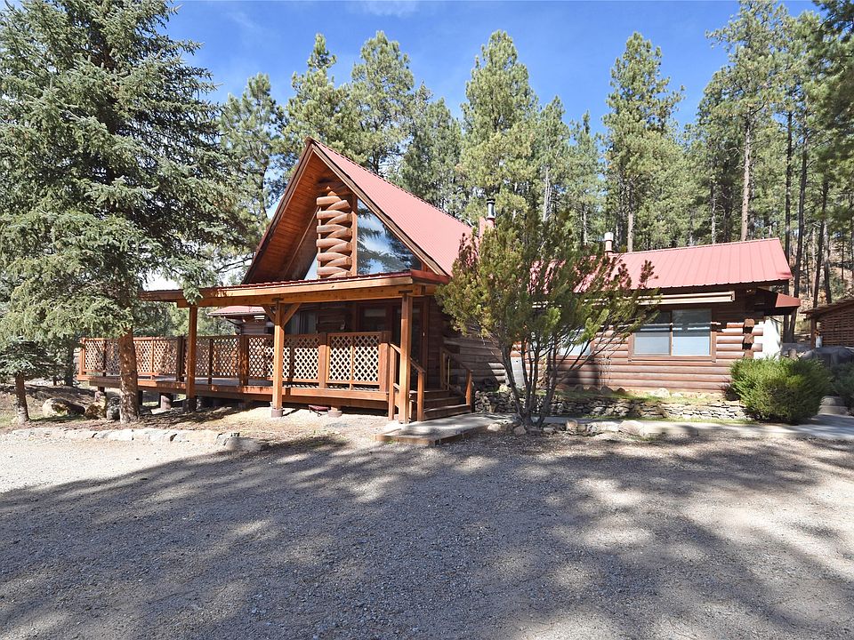 Situated on 3.08 acres encompassing two lots, this former Bed and Breakfast offers endless potential as a home or business venture. The main house has 1868 sq feet of lovely living space with an open-concept great room that showcases beautiful flagstone floors, natural log walls, knotty-pine ceilings and a wall of windows framing the breathtaking views of the Jemez Mountains. The two additional cabins provide potential business opportunities, studio workspaces or a family retreat. The 16X20 garage provides ample space for vehicles and storage. The property borders Santa Fe National Forest, where you can enjoy the Hot Springs, Valles Caldera, Bandelier, Hiking, Skiing and Mountain Biking. Only 45 minutes to Los Alamos, 1.5 hours to Albuquerque and 1.25 hours to Santa Fe.