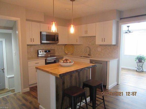 Seller Motivated! Rustic farmhouse ranch w/ 3 bedrooms and 1.5 baths renovated throughout! Foyer entry leads into living room w/ custom herringbone accent wall w/ live edge mantel, premier vinyl plank flooring, fresh paint and large window for natural light! Eat-in kitchen w/ white shaker cabinetry, quartz countertops, custom live edge butcher block island, herringbone backsplash, brushed brass hardware, pine barn door, premier vinyl plank flooring, and new ss appls! Large Mstr bedroom w/ barn door off kitchen could be family room, large closet, premier vinyl flooring leads to rear covered patio! Two additional bedrooms w/ new carpet and ceiling fans! Newly renovated main bath w/ quartz vanity, tiled tub surround, premier vinyl plank flooring, and brushed brass hardware! Venture downstairs to newly finished family/ rec rm, laundry room and new half bath! Waterproofed Bsmt; New furnace, ca, hwt! Updated electrical and plumbing! New roof, gutters, asphalt drive, garage door, entry doors, exterior lighting-10/2020! Fresh paint and flooring throughout! Custom Universal windows installed 3/23/21! Huge fenced rear yard w/ large covered patio! Beach access and Perry Park at end of road! Make Offer!
