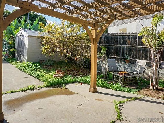 This bungalow exudes character and warmth, tucked away in one of San Diego's most convenient neighborhoods. Step through the front entrance and into a cozy living room featuring stunning wood floors and an abundance of natural light. The open-concept kitchen boasts modern cabinetry, granite countertops, stainless steel appliances including a fridge with an air fryer. Continuing down the hallway, you'll find built-in storage cabinets across from the updated full bathroom, complete with a newer vanity, countertop, cabinets, light fixture, and toilet. The spacious primary bedroom is equipped with a new ceiling fan and ample closet space, while the second generously-sized bedroom also offers a ceiling fan, a large closet, and access to a tranquil backyard retreat. This outdoor oasis has undergone a complete redesign and landscaping, featuring a shaded pergola trellis, enchanting gardens, outdoor lighting, and even your very own pomegranate tree. Enjoy the convenience of easy access to major freeways and the proximity to Coronado, the Gaslamp District, and Petco Park.