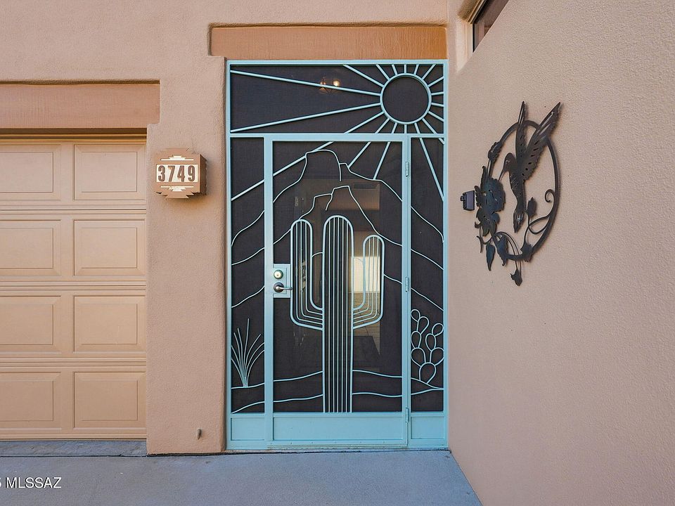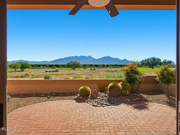 Wake up to breathtaking mountain views and enjoy your morning coffee on the sunlit paver patio while watching the early golfers tee off. This 2-bedroom, 2-bath townhouse offers a private guest suite, while the primary bedroom showcases magnificent mountain views, a remodeled bath with double vanity and walk-in shower, plus two closets for ample storage. The updated kitchen makes meal prep a pleasure as you look out to the Santa Ritas. Lovely cabinetry with soft close doors and drawers. Easy-care tile flooring flows throughout, and new windows with Hunter Douglas blinds let natural light pour in while keeping the winter chill out. The garage provides plenty of storage along with space for a vehicle and golf cart or bikes. Welcome to paradise--your new ''Home Sweet Desert Home!