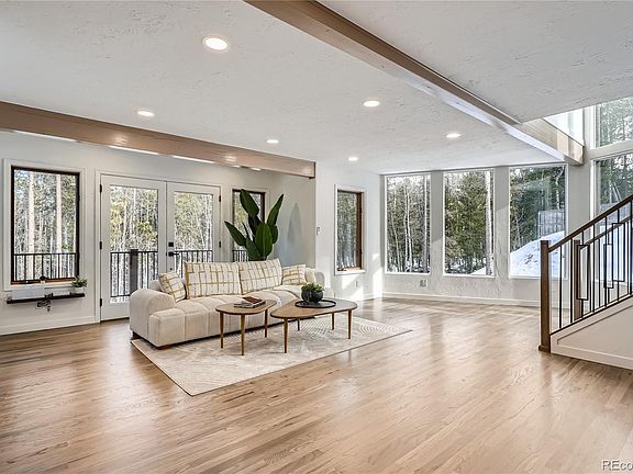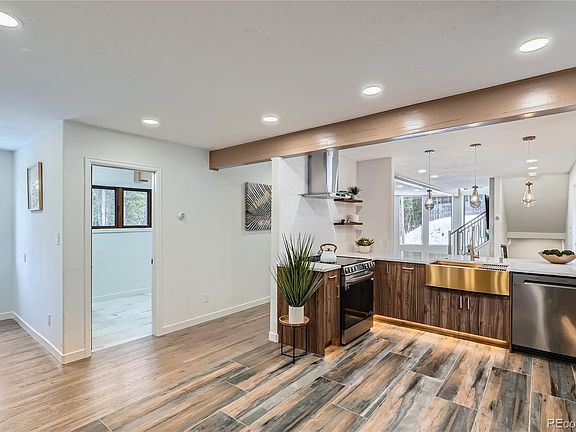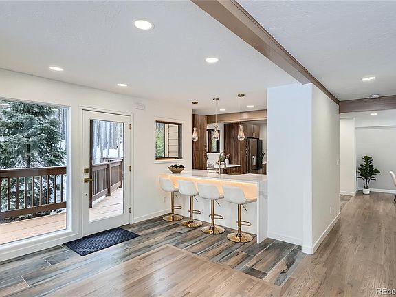 Nestled in the serene Brook Forest Estate community this fully remodeled home offers a harmonious blend of mountain home charm & modern comfort. The spacious living areas embrace contemporary architectural style, seamlessly blending with the surrounding natural beauty. Beautifully remodeled kitchen features brand new custom kitchen cabinets with under-mount lighting, quartz counters, custom tile backsplash, high-end brass farm sink & faucet, brand new stainless steel appliances with an air fryer in the oven, a large pantry & a dining room that can be converted into a study or a 4th bedroom. Solid wood frame windows let in an abundance on natural light that beautifully reflects off of freshly stained, radiant heated hardwood flooring, all new light fixtures & brass color hardware. Cozy up by the fireplace in front of your 4K 65 inch smart TV or step outside & marvel at the mountain views from one of the 3 newly stained balconies with iron cast railings. All bathrooms have been fully updated with quartz counter vanities, custom tile & heated floors. Large primary suite is a perfect retreat from a busy day with its ensuite bathroom, large walk-in closet & mountain views. Two more bedrooms (one is non-conforming) are located on the upper level & have an adorable Harry Potter secret closet. Everything in this home has been updated, including: a brand new roof, new gutters, new cast iron & wood staircase railings, new interior & exterior paint, solid wood doors, new water filtration system, stained deck, new garage door, certified septic system, vapor barrier in the crawl space, 220V charger in the oversized garage, RV parking, Google door bell & Starlink WIFI modem. This property offers the best of mountain living with easy access to the Evergreen Lake, hiking, biking and the breathtaking natural beauty of Colorado. Whether you're looking for a full-time residence or a weekend escape this home provides a unique opportunity to experience the tranquility of mountain life.