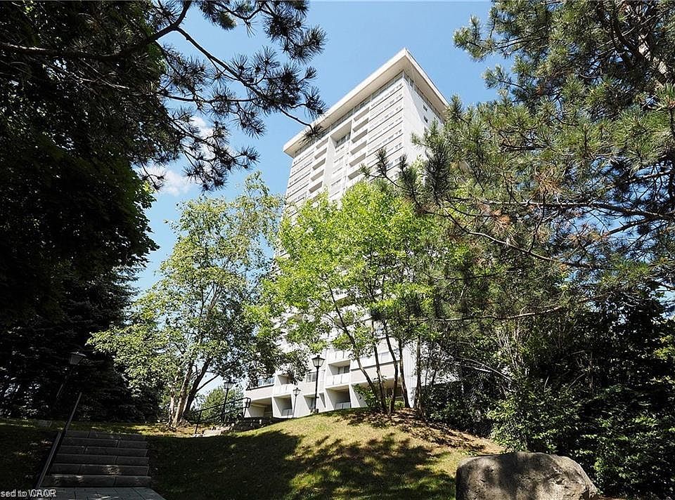 COLUMBIA PLACE! Fully renovated 1,175 square foot corner unit condominium. Wonderful open concept living & kitchen area! Bright kitchen with quartz island/breakfast bar and counter tops, stainless steel fridge, stove & dishwasher. Carpet-free with in-suite laundry, large linen closet & ample storage. All-inclusive condominium fee includes heat, central air, hydro, water, amenities, parking, storage locker & maintenance. On site facilities include: indoor pool, sauna, games room, library, full woodworking shop, hobby room, exercise room with equipment and running track, billiards/party room & car wash! Underground parking. Excellent location close to universities & convenient to Conestoga Mall & expressway. Originally a 3-bedroom unit & can easily be converted back!