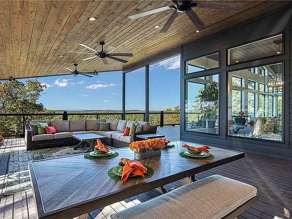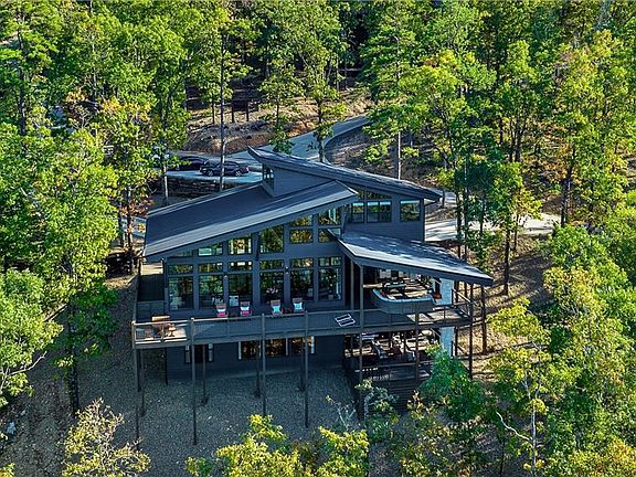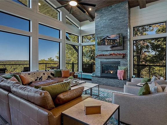 "Above and Beyond" is a contemporary tri-level cabin in Carter Mountain with amazing views! Windows with views in every direction. Outside you'll find nearly 2600 sf of covered deck and 900 sf uncovered, a built in grill with gas burner, a beverage fridge and a 9 person hot tub and 2 gas log fire places. All six bedrooms have a private bathroom, with add'l powder bath on the main floor and one on the lowest level. 2 beds up, master on main level and 3 beds on lower level. The kitchen has full overlay cabinets, a 12' quartzite waterfall island, Zline appliances, including a 48' range and 48 built-in GE Monogram refrigerator, 60 sink with 2 faucets and a commercial ice maker, 2 bev fridges. 3 AC units, 2 large capacity W/D, concrete circle driveway with additional parking on the street, interior lighted stairs. Just minutes from everything Hochatown has to offer. Matterport tour available in video link.