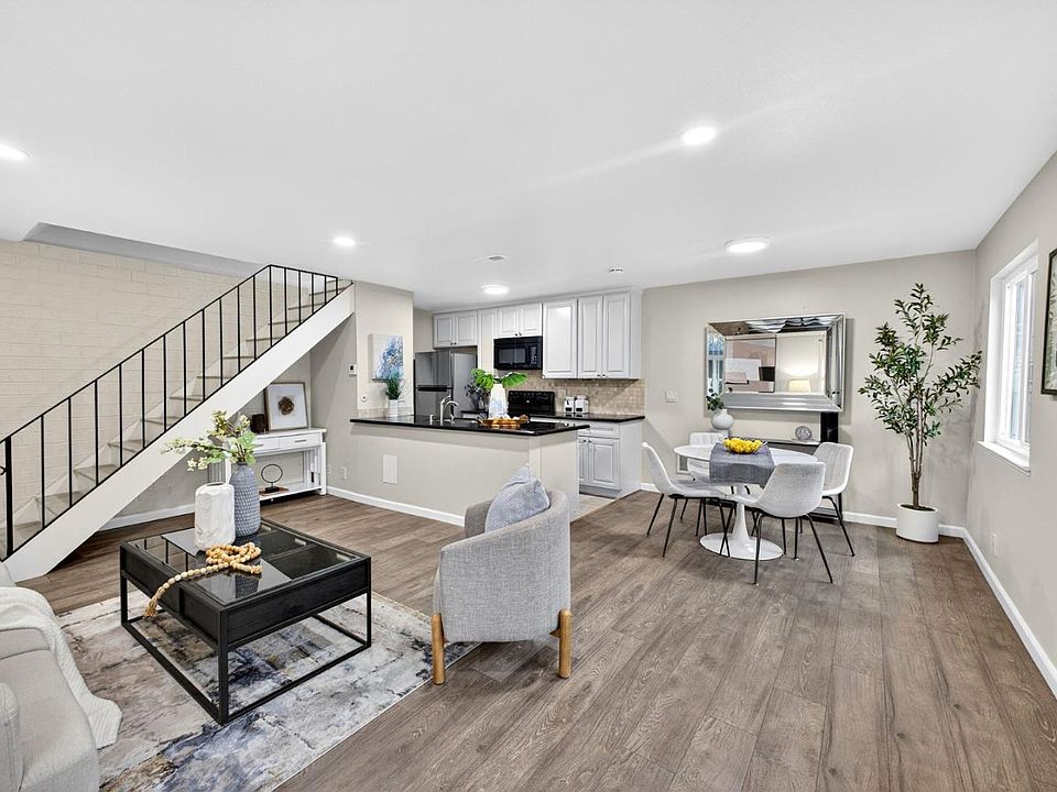 Warm finishesModern updatesSleek black countertopsLarge windowsNatural lightOpen-concept living spaceUpgraded appliances