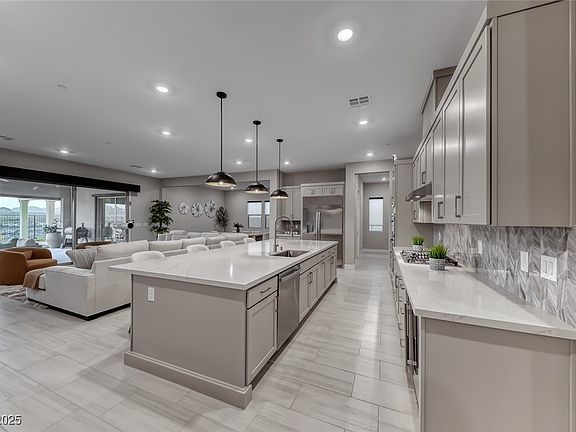 LAKE VIEWS! In the gated Portofino community at Lake Las Vegas, this furnished single-story home offers 5 bedrooms & 4.5 baths & includes landscaping, pool service, & trash! The open layout features a gourmet kitchen w/oversized island, quartz counters, custom cabinetry, stainless appliances,& built-in oven, opening to a great room w/floor-to-ceiling fireplace & sliding doors for indoor/outdoor living. The covered patio w/outdoor furniture overlooks the private heated pool/spa, fire-feature seating,& views. Includes an attached multi-gen suite w/ bath, ideal for long-term visitors. The primary includes a walk-in shower, separate tub, dual vanities, & large closet. 3 guest bedrooms w/carpet, upgraded lighting & window coverings. A flex room supports remote work or study. Laundry room offers cabinetry & sink. A 3-car garage adds storage. OPTIONAL access to the Lake Las Vegas Sports Club. Lake Las Vegas offers water activities, dining, retail, & seasonal concerts around a 320-acre lake.