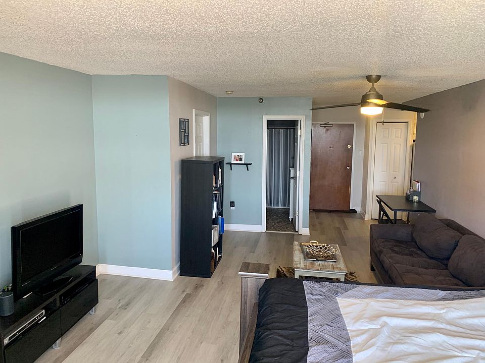 Large bright high-rise studio apartment with on-site gym, pool, a huge gated and lit dog walking area and incredible skyline views! Building also features a 24 hour front desk concierge, and unit comes with your own reserved covered and gated parking spot! Brand new engineered hardwood floors throughout, a walk-in closet (note in the pictures that there is storage on BOTH sides), stainless steel fridge, stainless steel dishwasher, stainless steel range and a beautiful private balcony that looks out over the city and that your visitors will be amazed by! The Beltline, Old Fourth Ward Park and Ponce City Market all less than a mile away. Pets welcome (though note building restricts some dog breeds) and in addition to the on-site dog-walking area, Freedom Barkway Dog Park is only 3 blocks away! Skyline photos were taken from the private balcony of the unit! A flat monthly fee of $60 covers all utilities except cable/internet. One year or longer lease available - unit available for move in February 1. Family owned unit. 1 year or longer lease - available March 1 or possibly sooner. Please reach out with questions or to set up a time to view! 1 year or longer lease available. All utilities (except cable/internet) are included for a flat fee of $60 per month total. Individual owner, not a management company.