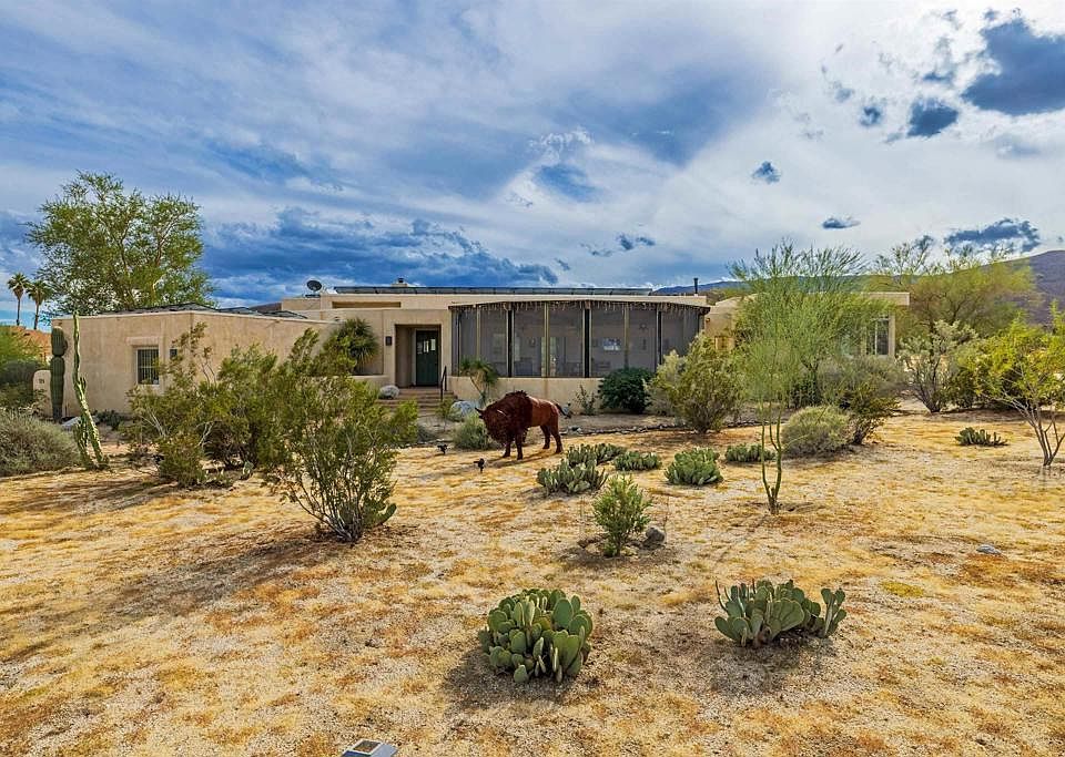 Designed for optimal energy efficiency, this amazing home features both passive solar design and an owned 35-panel solar system. Plantation shutters and rolling electric metal shutters on most windows further enhance comfort and efficiency. The main house offers beautiful luxury vinyl tile flooring, a spacious kitchen with new cabinetry, appliances, and stunning quartzite countertops on the kitchen island. A cozy den provides flexible space for an office or media room, and there is also a convenient half bathroom. The generous primary suite is located in the main house and opens to the private patio between the main and guest houses. The fully renovated primary bathroom is a dream, featuring a large zero-entry walk-in shower. The guest house showcases tall windows with beautiful views, adding abundant natural light and an inviting feel. The expansive screened-in porch functions as a true outdoor living space, complete with power, water, a ceiling fan, and generous square footage—perfect for relaxing or entertaining. This home also features an oversized garage with a dedicated workshop area, perfect for projects or storage. A zero-barrier entry into the home, created by an integrated disability ramp, ensures smooth and convenient access for all. Additional highlights include a rooftop deck ideal for stargazing and an overall layout designed for comfort, functionality, and a seamless indoor-outdoor lifestyle.