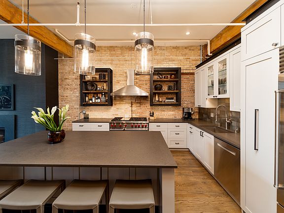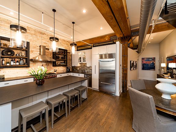 Introducing a meticulously reimagined 2000 sq ft. end unit 2 Bed 2 Bath + office duplex penthouse in the heart of River North. Boasting a 21x16 private roof deck, an expansive, extra-wide floor plan that includes exposed brick & timber beams, 11-foot ceilings, generous room sizes and unobstructed views. The first floor has been completely refreshed, including refinished oak floors, designer lighting, paint, new baseboards, and doors, and Lutron Smart Lighting. An entertainer's dream, the kitchen opens into an expansive living room and balcony and is equipped with a 6-burner Wolf range, a Sub-Zero refrigerator, quartz countertops, and a Kraus sink with Grohe fixtures. Designer updates include custom wallcoverings, knurled hardware, a new fireplace surround and Circa lighting. The second floor was gutted to the studs and entirely reconfigured, featuring new oak floors, baseboards, doors, designer lighting, and custom drapery. The brand-new spa-inspired primary bathroom is equipped with Brizo faucets, a Toto toilet, 96" double vanity and custom walk-in closet. Additional upgrades include a home office room with custom wallpaper, and a redesigned laundry room featuring an abundance of storage and an extra-large capacity LG washer/dryer. The outdoor roof top is beautifully landscaped and lit, complete with a new indoor bar and beverage fridge, perfect for outdoor entertaining. A large storage closet is included, and one premier garage space is available for $35,000. The full-amenity building offers 24-hour door staff, a bright top floor gym, a party room leading to a common roof deck, a receiving room, a bike room, and on-site dry cleaners. Located steps from the River Walk, Montgomery Park, dog parks, countless restaurants, cafes, shops, East Bank Club, the train, and expressway access, this end unit penthouse loft is a rare opportunity to experience luxury living in River North.