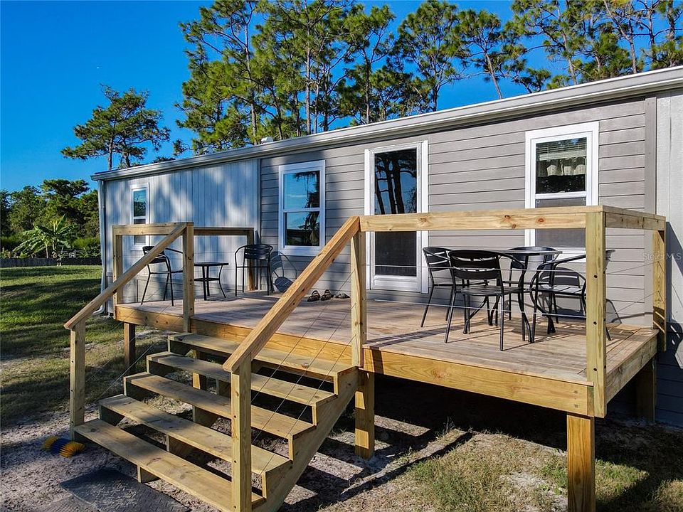 Discover the charm of country living on this beautifully renovated 6.5-acre property, perfectly tucked away in rural Deltona adjacent to Lake Helen. With endless possibilities for homesteading, hobbies, or simply enjoying the peace and privacy, this property is truly one-of-a-kind. Inside, the home offers 3 bedrooms, 2 bathrooms, plus 2 versatile flex rooms—ideal for guest bedrooms, a home office, or creative space. The fully updated kitchen boasts brand-new cabinetry, butcher block countertops, stainless steel appliances with a gas range, and a farmhouse sink. The dining area flows seamlessly into the living room, where an electric fireplace provides cozy warmth in the winter and year-round ambience. Step outside to a property designed for both comfort and function: Fenced garden, fenced play yard, custom chicken coop, and pole barn with 2 stalls and 2 runs. An additional 2 car carport towards the back of the property for extra storage/work space. Fenced front and back pastures, ready for livestock, with a mix of hot-wire and four-board fencing. Upgraded 400-amp electric service with two RV hookups. New well, well shed, and septic system (2023). Every inch of the home was renovated in 2023, including a brand-new metal roof, siding and skirting, windows, drywall, flooring, paint, and fully remodeled kitchen and bathrooms. A water softener system adds convenience, and the upgrades ensure peace of mind for years to come. Whether you dream of starting a homestead, keeping animals, or simply enjoying your own private slice of Old Florida charm, this property has it all. Homes like this don’t come along often—schedule your showing today!