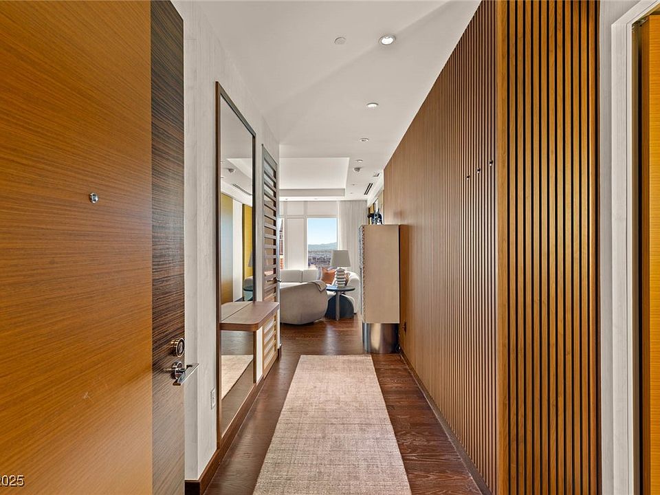 Elevated high above the Strip at Waldorf Astoria Las Vegas, this highly desirable South facing "02" floor plan spans 1,090 square-feet of tastefully reimagined space, offering unmatched elegance. Floor-to-ceiling windows frame sweeping city and mountain vistas, drawing the skyline into the generous living room. The designer kitchen contrasts sleek cabinetry, premium appliances and a custom built-in dining area is ideal for dining, home office or personal lounge. The upgraded primary suite is a sanctuary of calm with plush finishes and a spa-style bath. Residents enjoy discreet, five-star services including a private entrance, valet, owners’ lounge, full-service spa and rooftop pool deck. Rare in its size and scope, this home blends streamlined modern living with iconic Las Vegas luxury. Curated, furnished, and move-in ready—elegance included.