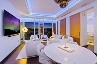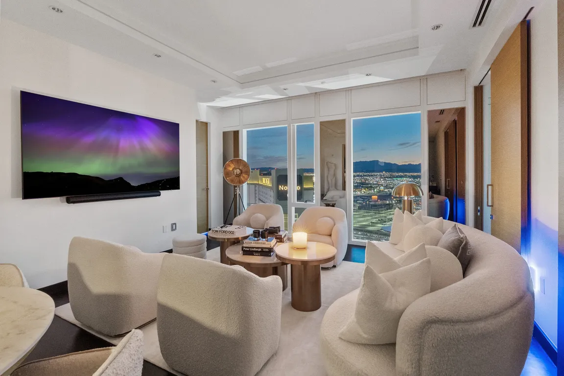 Welcome to the epitome of Strip-side sophistication. This fully customized Waldorf Astoria residence redefines luxury living. Positioned high above Las Vegas, this unit showcases new oak wood flooring, built-in color-changing LED lighting, RTI smart home system with integrated music, TV, & blackout shades. The bespoke culinary space boasts Thermador appliances, Calcatta ...