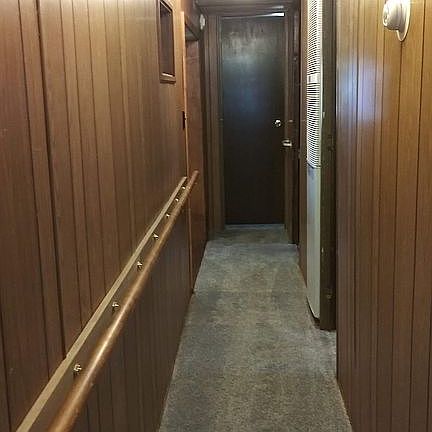 Lot rent is $500 plus water. Older but clean trailer home. Unique 70s paneling and decor. Safety railings on stairs, along the hallway, and in the bathroom. Walk-in shower