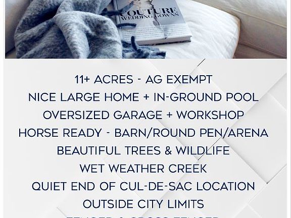 An exceptional opportunity awaits at the end of a tranquil cul-de-sac, where country living harmonizes with contemporary conveniences. A true equestrian's dream, featuring pipe fencing, a round pen, horse barn, arena, and loafing shed—well-equipped for all your horse management needs. Need more land? Separate 5-acre parcel available for purchase at additional cost, water and electric available, perfect for a second home to be built or more land for animals to graze. This enchanting 11-acre ranchette boasts a spacious 4 bedroom, 2 and a half bath home that perfectly blends functionality and style. The property includes large chicken coops and a newer workshop, offering endless hobbyist possibilities. Picture mornings sipping coffee on expansive front and back porches or sun room, or evenings tending to sprawling gardens and observing wildlife. Nature's beauty enhances the acreage with a mix of mature trees, a wet weather creek, and multiple fenced areas, maintaining an Ag exemption. Whether exploring the lush grounds or simply enjoying the gentle breeze through the trees, this Cleburne ranchette provides a sanctuary from city life while offering every amenity for modern living. Inside, you'll discover a large family room enriched with built-ins and a cozy wood-burning stove, framed by elegant wood-look tile flooring. The expansive living room, highlighted by new picture windows, offers serene views of the in-ground pool, creating a seamless indoor-outdoor connection. The cook will appreciate the generously-sized kitchen adorned with granite countertops, perfect for entertaining. An at-home office featuring built-ins caters to contemporary work-from-home needs. Designed for privacy, the split bedroom floorplan places the primary suite in its own serene enclave. Recent HVAC upgrades ensure year-round comfort. Experience the allure of country elegance in this picturesque retreat. Schedule your showing today!