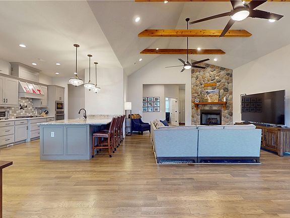 Framed by stone and cedar, this modern rustic beauty stands out with beautiful design touches. This one level, open floor plan features cedar beams, wood floor, a stacked-stone gas log fireplace. An eat-in kitchen boasts a large island, 5-burner gas stove with pot filler, a pantry & coffee/wine bar area. The primary suite is a true retreat with a whirlpool tub, walk-in shower with dual heads, dual vanities & a spacious closet with built-ins. There are 3 more bedrooms, 2 additional full baths PLUS an office. A covered patio provides great entertaining space. Enjoy cool nights sitting by the outdoor stone fireplace or grilling steaks at your outdoor kitchen. Highlights: tankless water heater, exterior uplighting, irrigation system, central vacuum & 3-car garage with epoxy floors. Cook smores in fireplace or picnic at the community pavilion. Ideally located near I-49, XNA, Bentonville West High, Coler MTB Preserve, and WMT Global Campus—all within 10 minutes. One owner home. See Feature Sheet for even more information