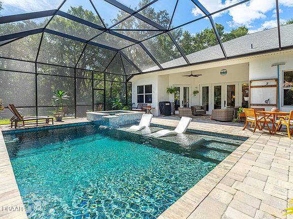 Stunning Halifax Plantation golf course custom pool home on a huge and private ¾ acre corner lot the 6th tee. Limestone flooring welcomes you into this expansive, light-filled home with a beautiful wood trim package and turn of the century stained glass windows. Custom hickory cabinetry and doors with Emtek Arts and Crafts bronze hardware throughout. Extensive MIII Pack and Minka Lavery Bronze Lighting w/Murano Glass throughout home. You will love the chef's dream gourmet kitchen with 42'' hickory cabinets with water mark glass, level 8 granite and stainless appliances with large eat-in area with built-ins and formal dining room. Large master bedroom features a sitting area, trey ceilings, his and hers walk-in closets and large ensuite bathroom with dual vanities, large soaker tub plus walk-in shower. The outside oasis feels like you are on vacation with new in 2023 fully automated saltwater heated and enclosed pebbletec resort style pool with large sun shelf and heated spa. Covered sitting area looks out over private back yard with citrus trees and fire pit area. Other upgrades include new roof 2021, fresh paint inside and out, shark coated garage floors in the oversized garage, stone sills on all the windows and new ceiling fans throughout. You will feel protected with a home warranty in place. Hurry before this gem is gone.